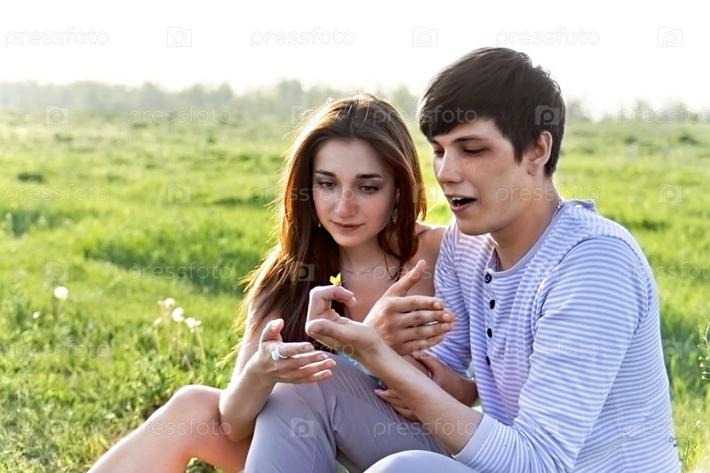 Молодая пара на открытом воздухе. Мягкий вечерний солнечный свет