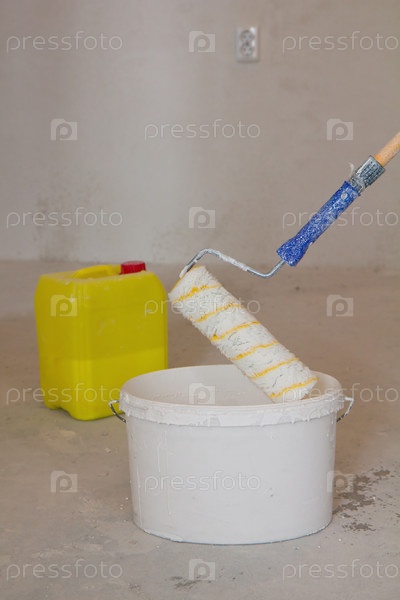 Ведро белой краски и валик