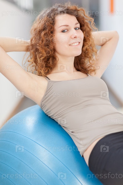 Молодая женщина делает упражнения с мячом в тренажерном зале
