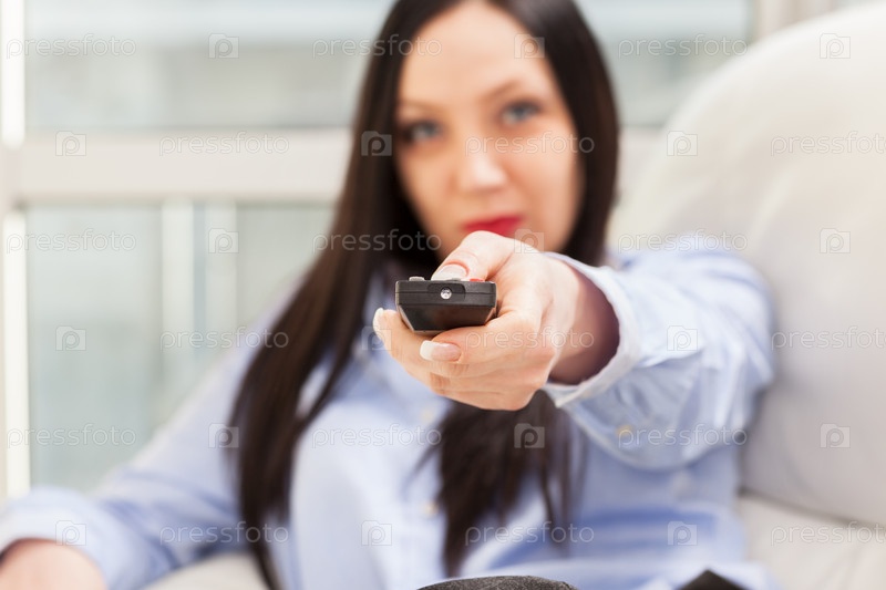 Привлекательная женщина с пультом дистанционного управления в руке