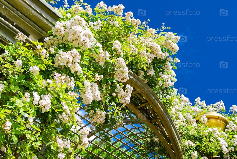Освещенные солнцем вьющиеся цветы в Садах Версаля, Франция