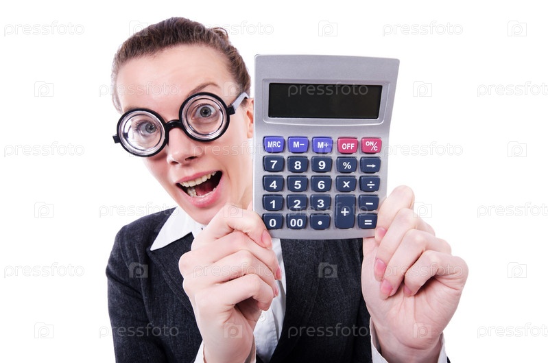 Смешной бухгалтер с калькулятором на белом фоне