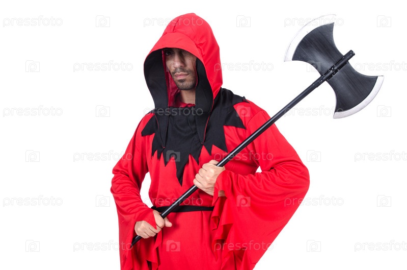 Палач в красном костюме с топором на белом фоне