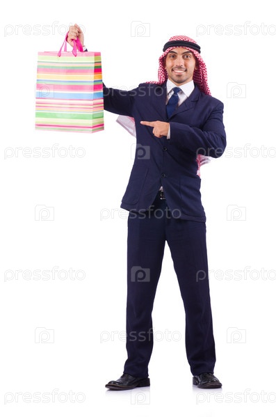 Араб с покупками на белом фоне
