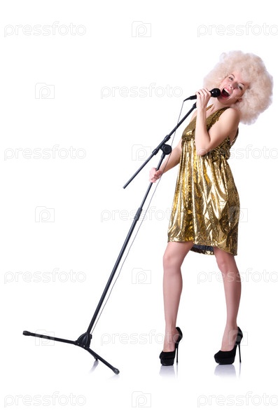 Поп-звезда с микрофоном на белом
