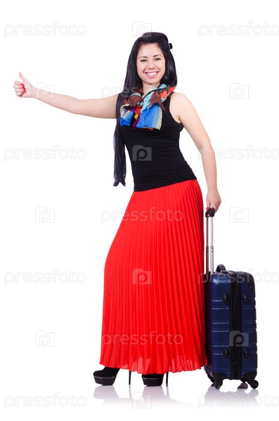 Молодая женщина готова к отпуску на белом фоне