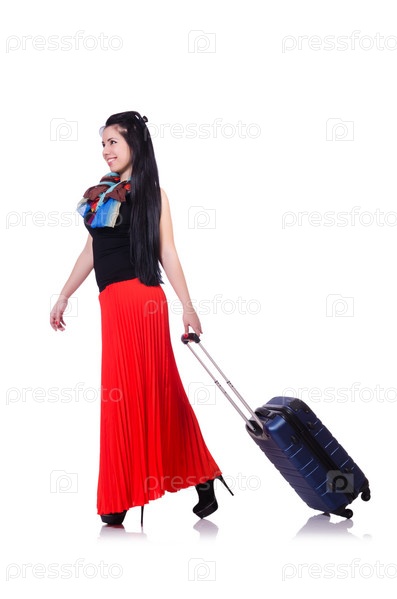 Молодая женщина готова к отпуску на белом фоне