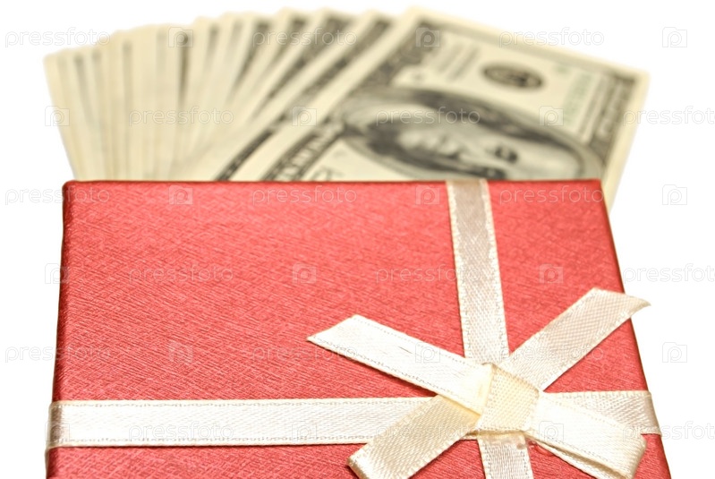 Коробка с подарками и пачка долларов