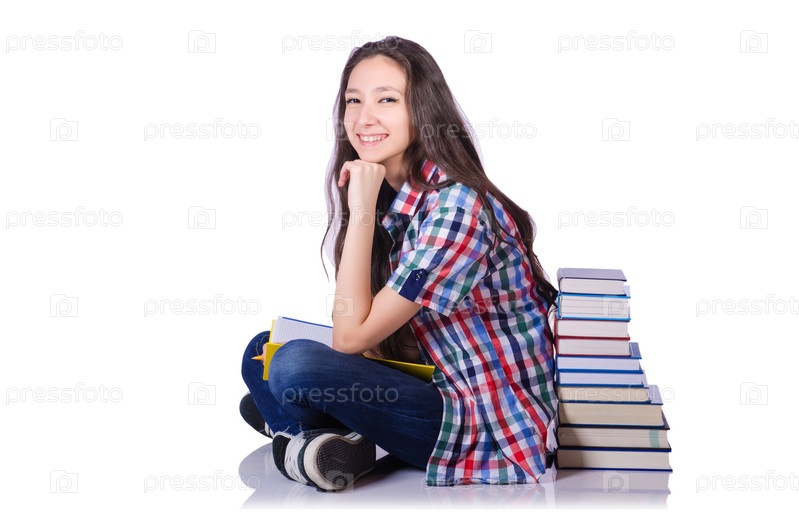 Студентка с книгами, изолированная на белом