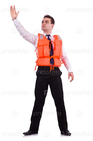 Бизнесмен в спасательном жилете на белом
