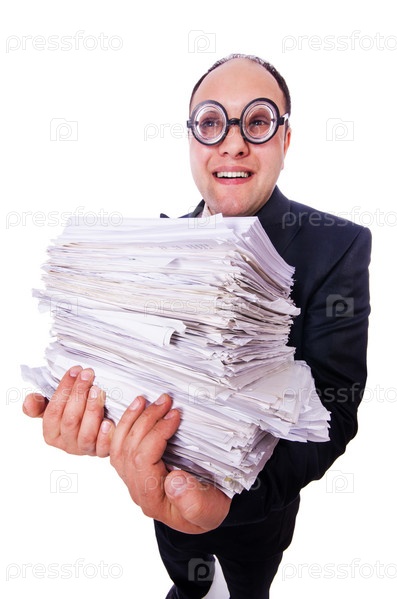 Забавный мужчина с большим количеством документов на белом фоне