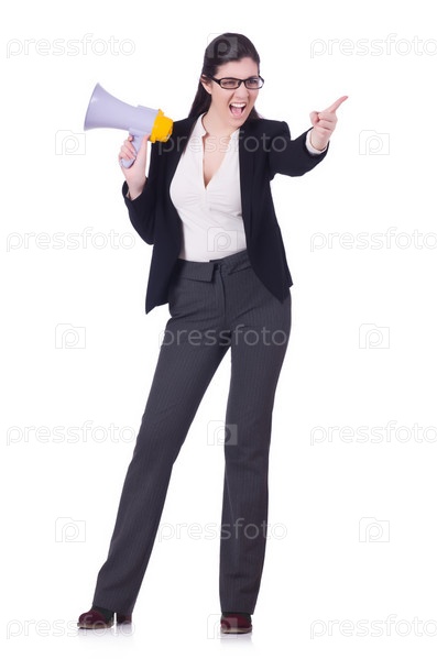 Женщина кричит в громкоговоритель на белом фоне
