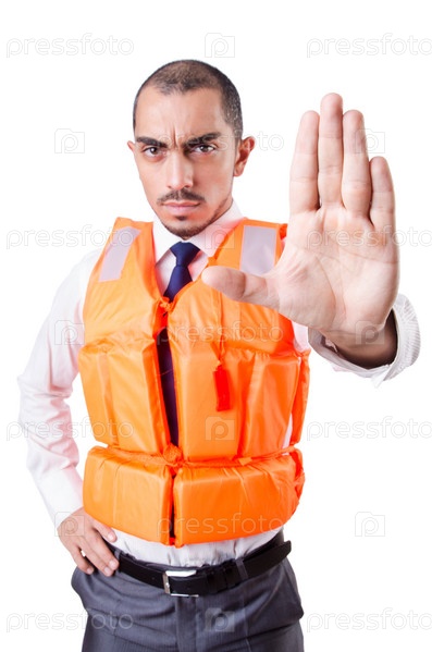 Человек в спасательном жилете, изолированный на белом фоне