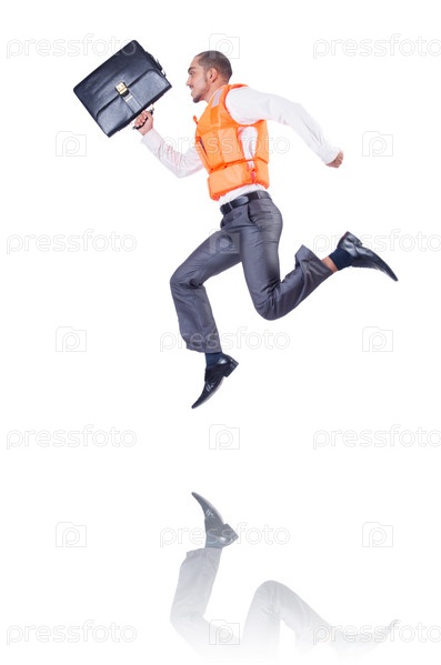 Человек в спасательном жилете, изолированный на белом фоне