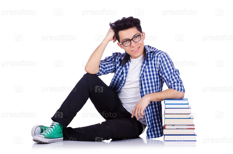 Студент с книгами на белом