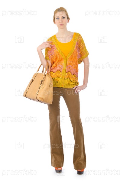 Женщина в модной одежде на белом фоне