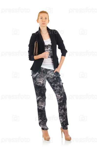 Женщина в модной одежде на белом фоне
