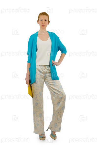 Женщина в модной одежде на белом фоне