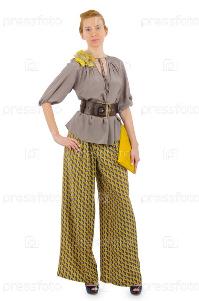 Женщина в модной одежде на белом фоне
