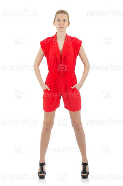 Женщина в модной одежде на белом фоне