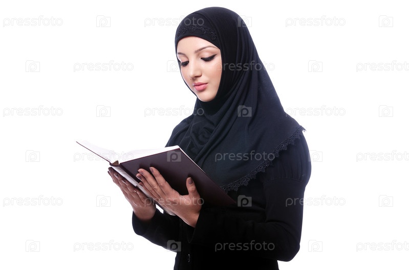 Молодая мусульманская женщина с книгой на белом