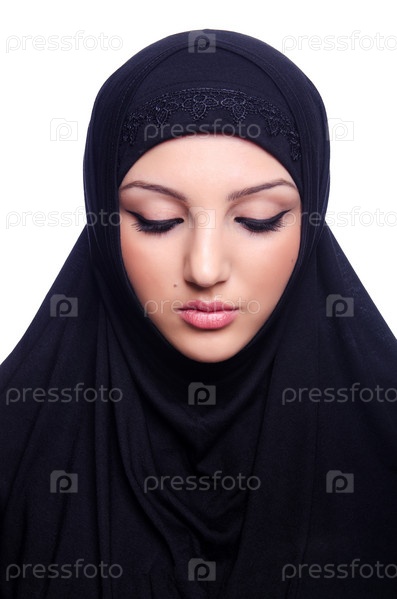 Мусульманская молодая женщина в хиджабе на белом