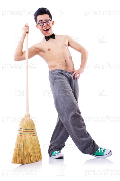 Забавный человек с веником на белом фоне