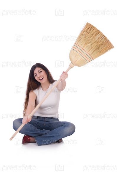 Молодая женщина с веником, изолированная на белом