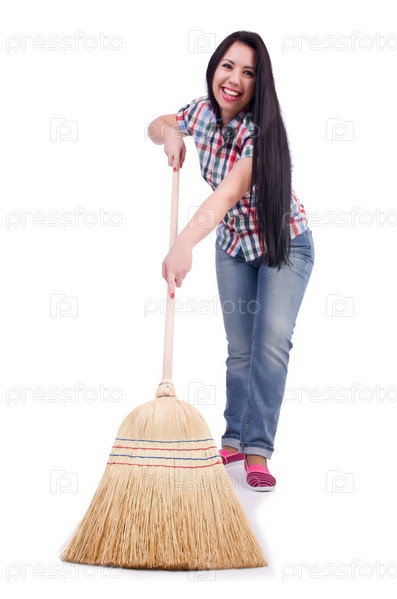 Молодая женщина с веником, изолированная на белом фоне