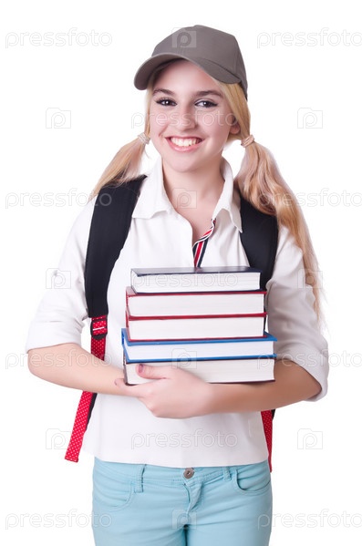 Девушка студент с книгами на белом фоне