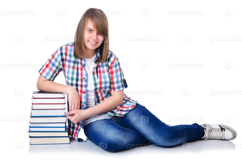 Девушка студентка с книгами на белом