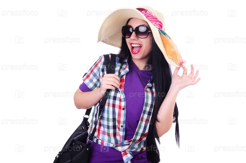 Молодая женщина, готовая к летним каникулам, на белом фоне