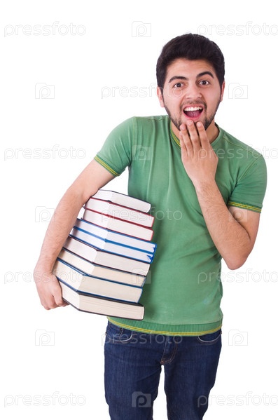Студент с большим количеством книг на белом фоне