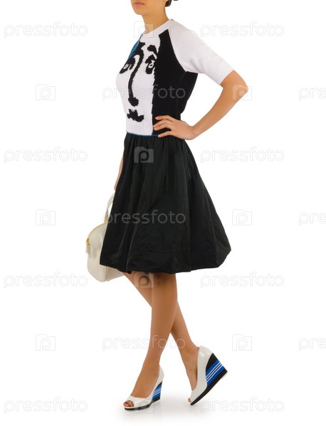Женщина в модной одежде на белом фоне