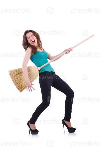 Молодая женщина с веником, изолированная на белом фоне