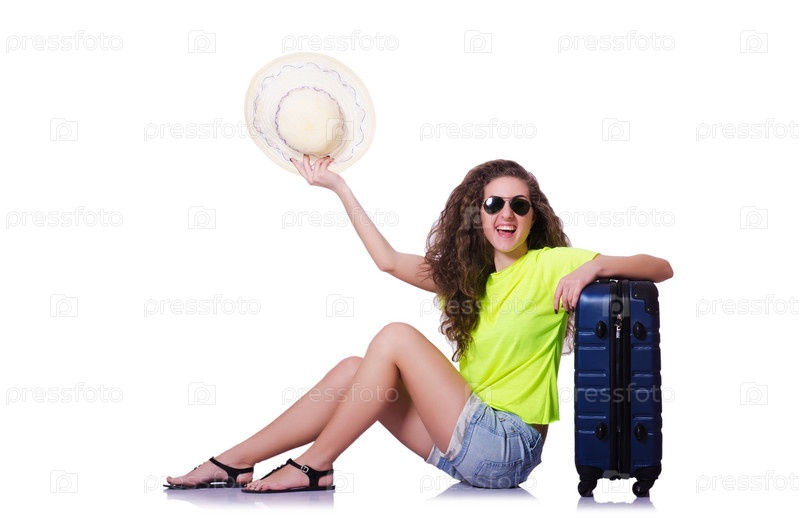 Молодая женщина с чемоданом на белом фоне