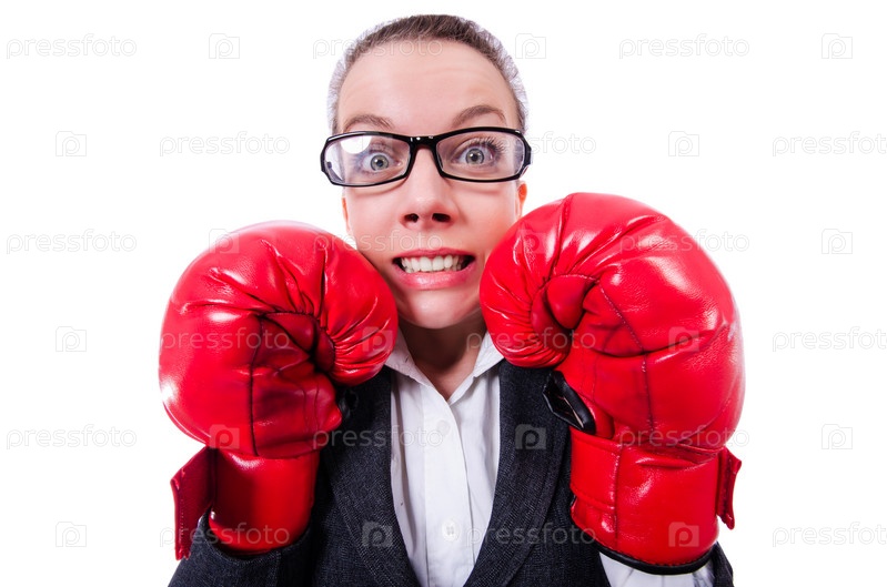 Женщина в боксерских перчатках на белом фоне