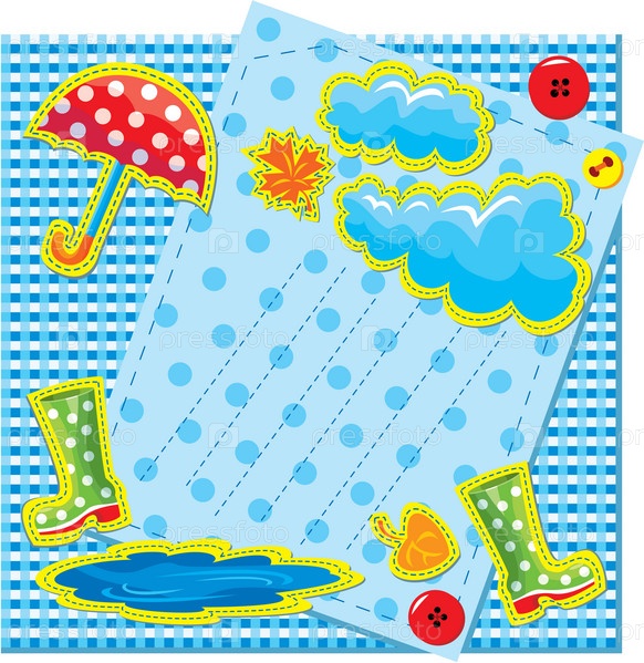 Рамка в осеннем стиле с дождем, облаками, лужами, резиновыми сапогами и зонтом на клетчатои фоне и фоне в горох