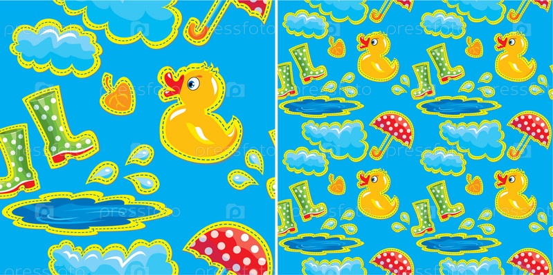 Бесшовный шаблон с резиновой уткой, сапогами, облаками, зонтом и лужами. Осенний детский дизайн