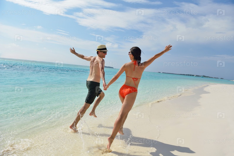 Счастливая молодая пара весело проводит время на пляже