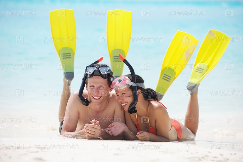 Счастливая молодая пара весело проводит время на пляже