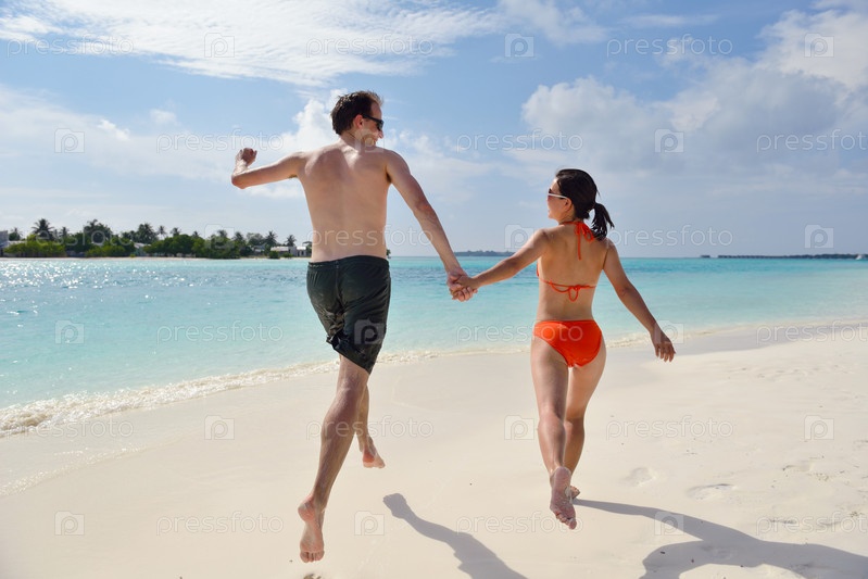 Счастливая молодая пара весело проводит время на пляже