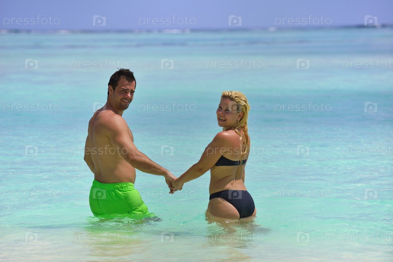 Счастливая молодая пара весело проводит время на пляже во время летних каникул