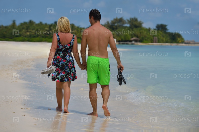 Счастливая молодая пара весело проводит время на пляже во время летних каникул