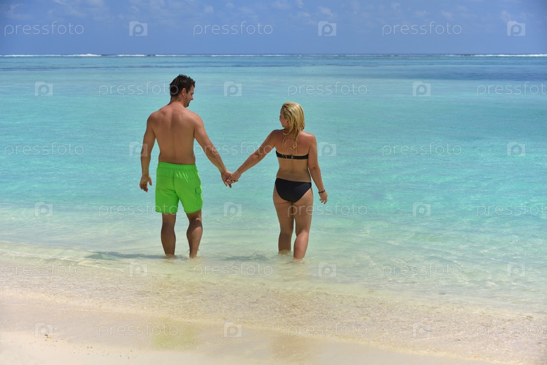 Счастливая молодая пара весело проводит время на пляже во время летних каникул