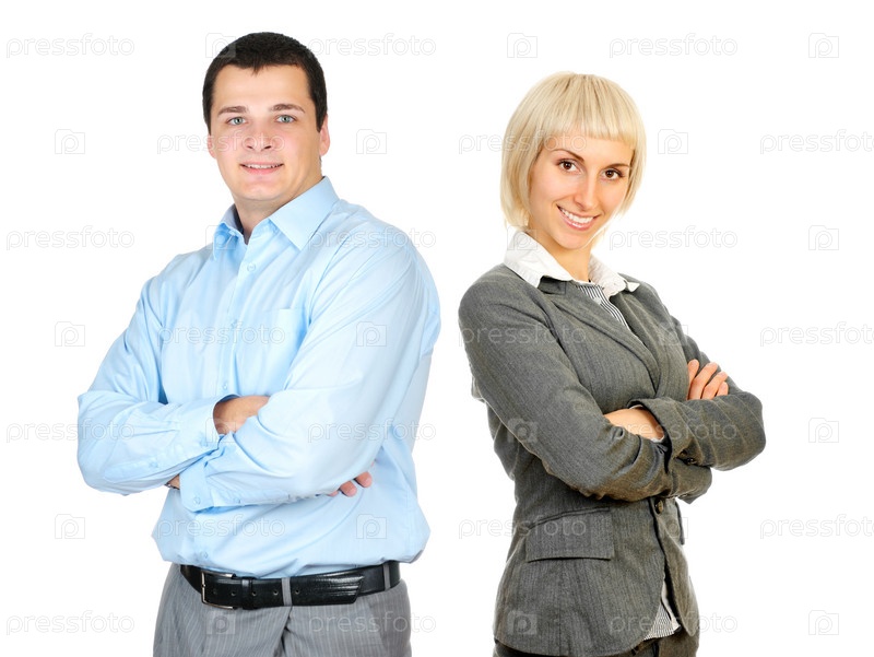 Уверенные молодой человек и девушка в деловых костюмах на белом фоне