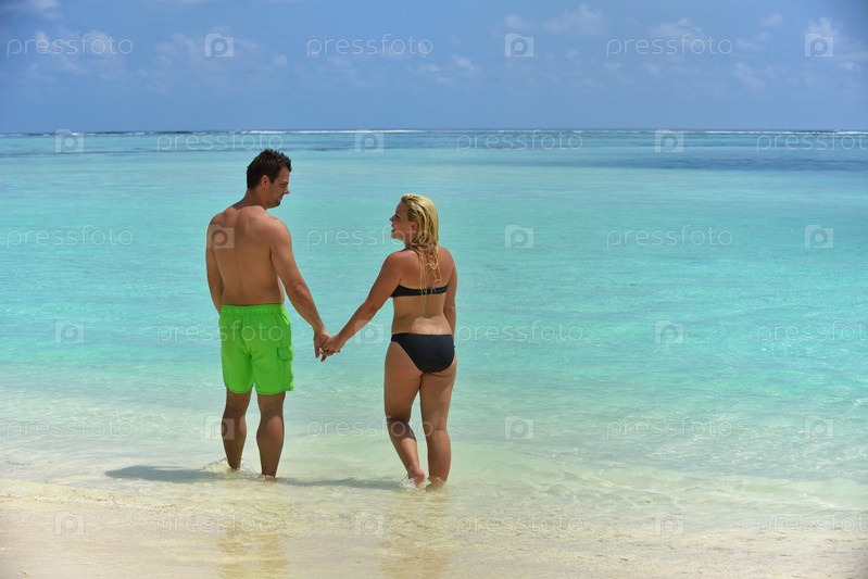 Счастливая молодая пара весело проводит время на пляже во время летних каникул