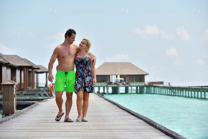 Счастливая молодая пара весело проводит время на пляже во время летних каникул