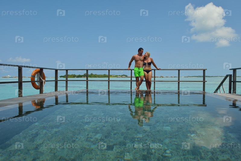 Счастливая молодая пара весело проводит время на пляже во время летних каникул