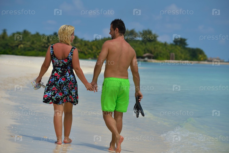 Счастливая молодая пара весело проводит время на пляже во время летних каникул